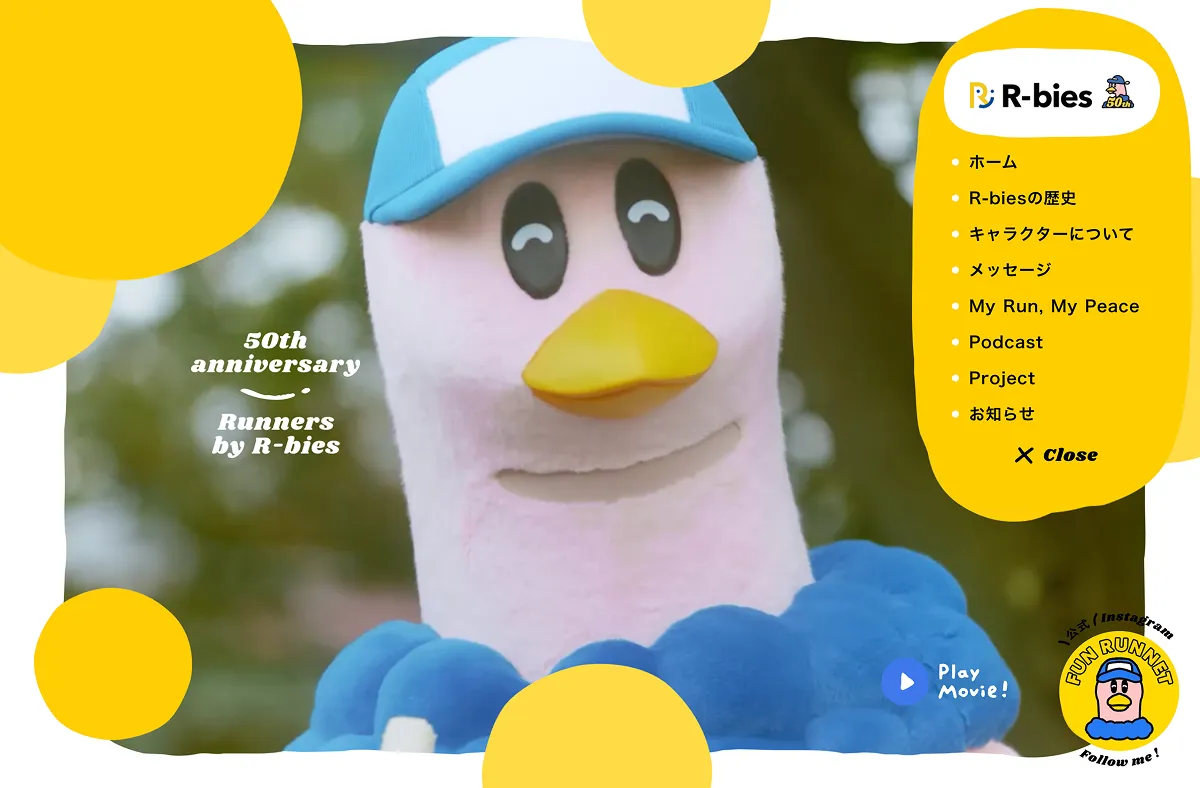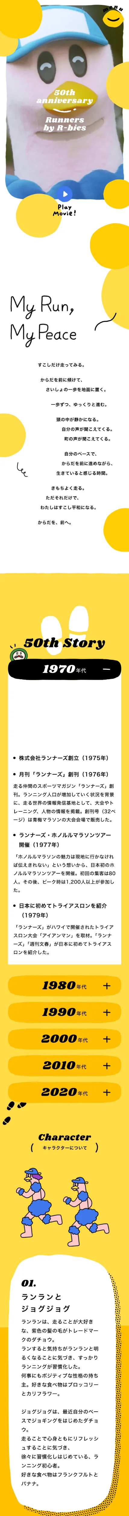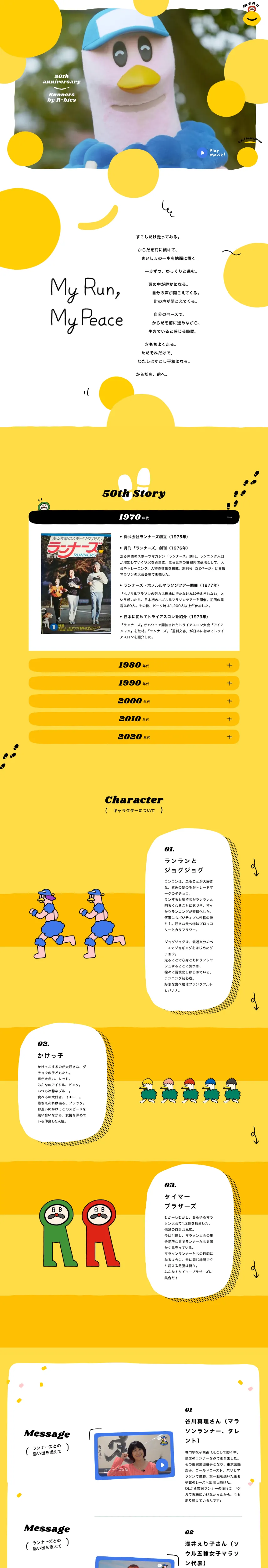https://50th.runners.co.jp/株式会社アールビーズ創立50周年特設サイト。50周年のスローガン「My Run, My Peace」を掲げ、新キャラクター「ランラン&ジョグジョグ」(デザイン:清水貴栄氏)やコンセプトムービーを公開。50年の歴史やランナーインタビューなど、ランナーの走ることで得られる心の平穏(Peace)を再発見するコンテンツをお届けします。