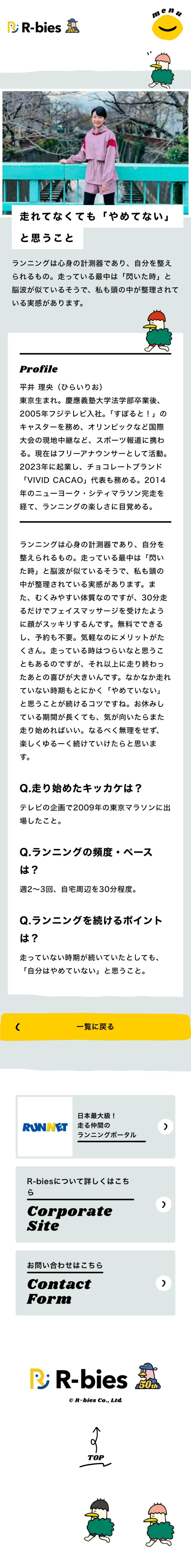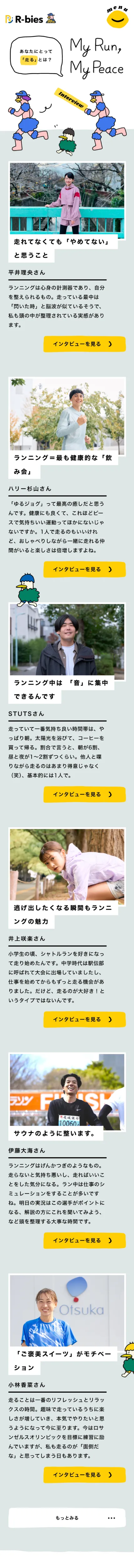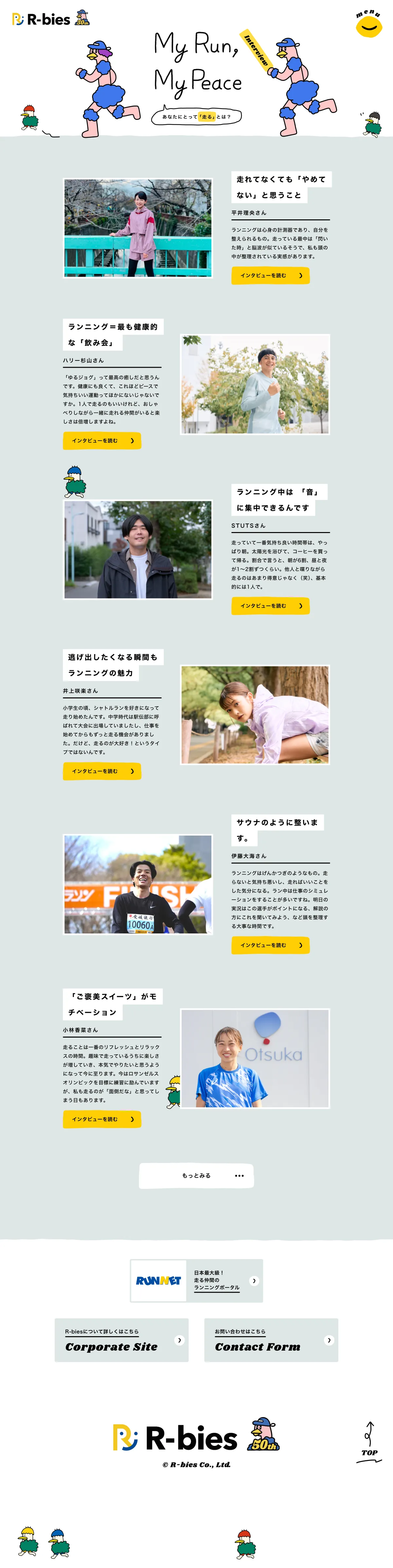 https://50th.runners.co.jp/株式会社アールビーズ創立50周年特設サイト。50周年のスローガン「My Run, My Peace」を掲げ、新キャラクター「ランラン&ジョグジョグ」(デザイン:清水貴栄氏)やコンセプトムービーを公開。50年の歴史やランナーインタビューなど、ランナーの走ることで得られる心の平穏(Peace)を再発見するコンテンツをお届けします。