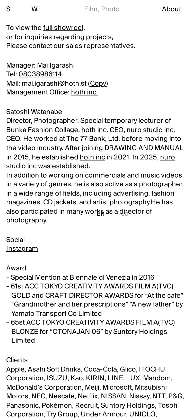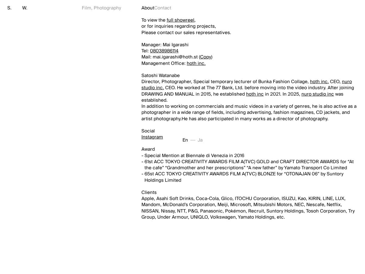https://satoshiwatanabe.org/渡邊 哲(hoth inc.代表)、映像ディレクター・フォトグラファー。広告、音楽、ファッションなど幅広い分野で活動。文化服装学院特別非常勤講師。Satoshi Watanabe (Representative Director, hoth inc.), Video Director & Photographer. Active in a wide range of fields including advertising, music, and fashion. Special Part-time Lecturer at Bunka Fashion College.