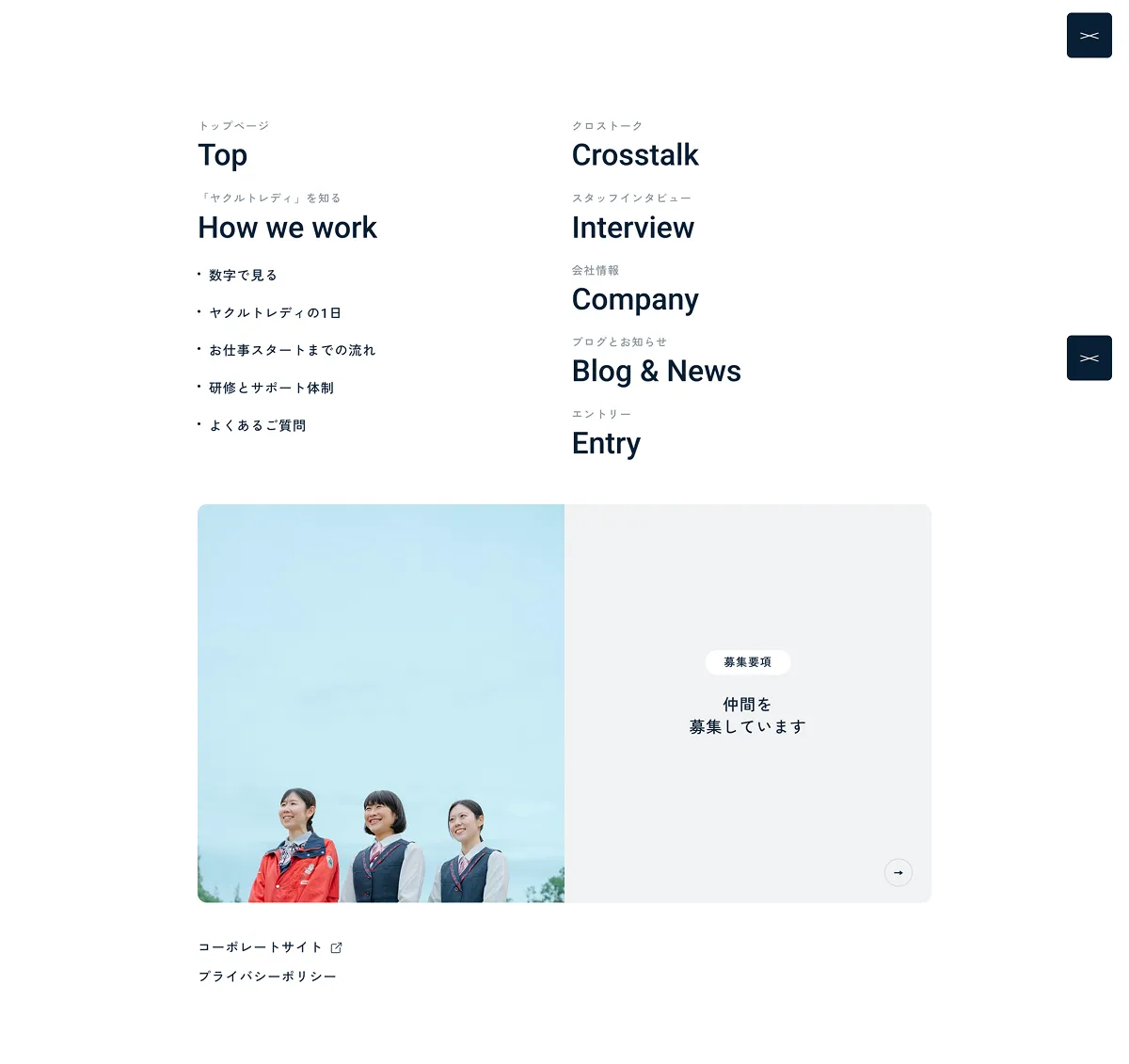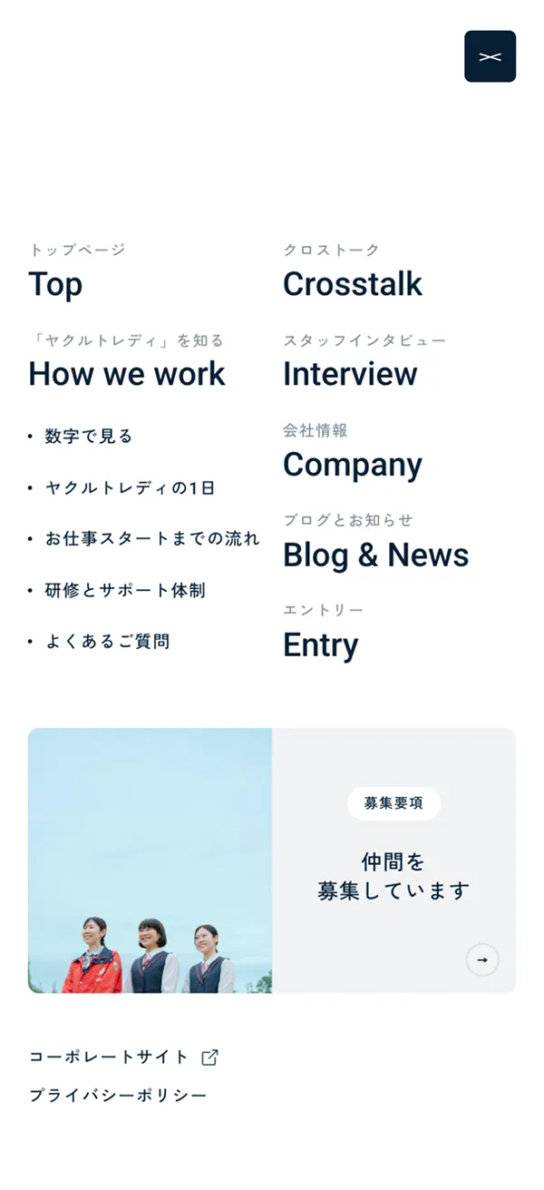 短く洗練されたコピーと、下層ページの縦書き表現が、サイト全体のメッセージ性を際立たせています。