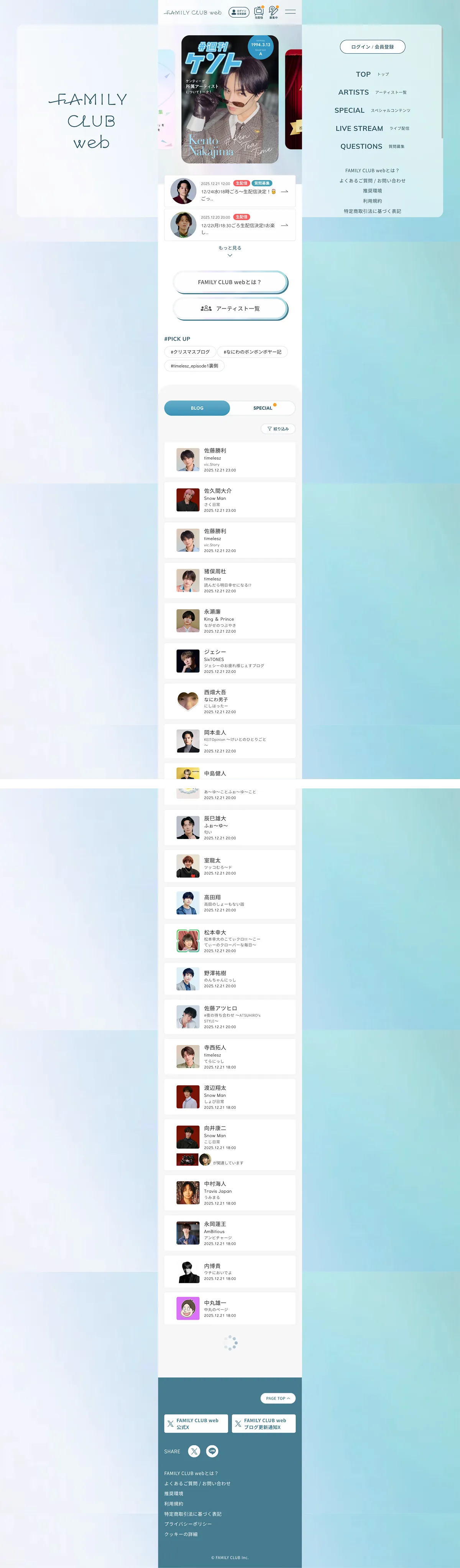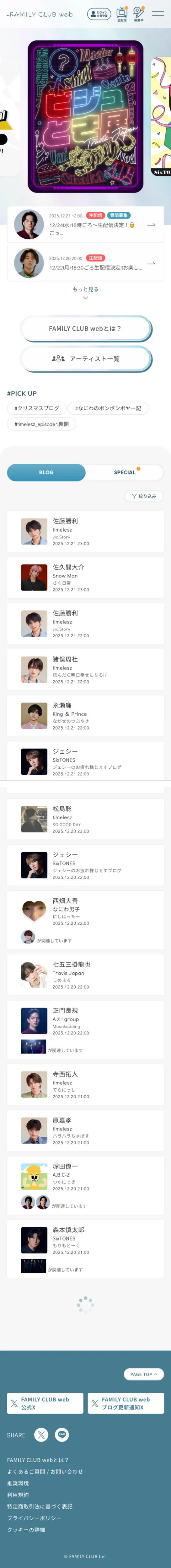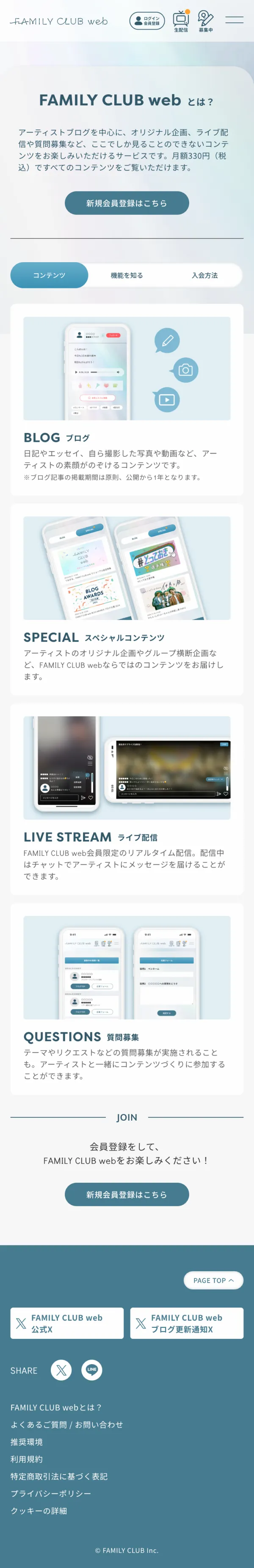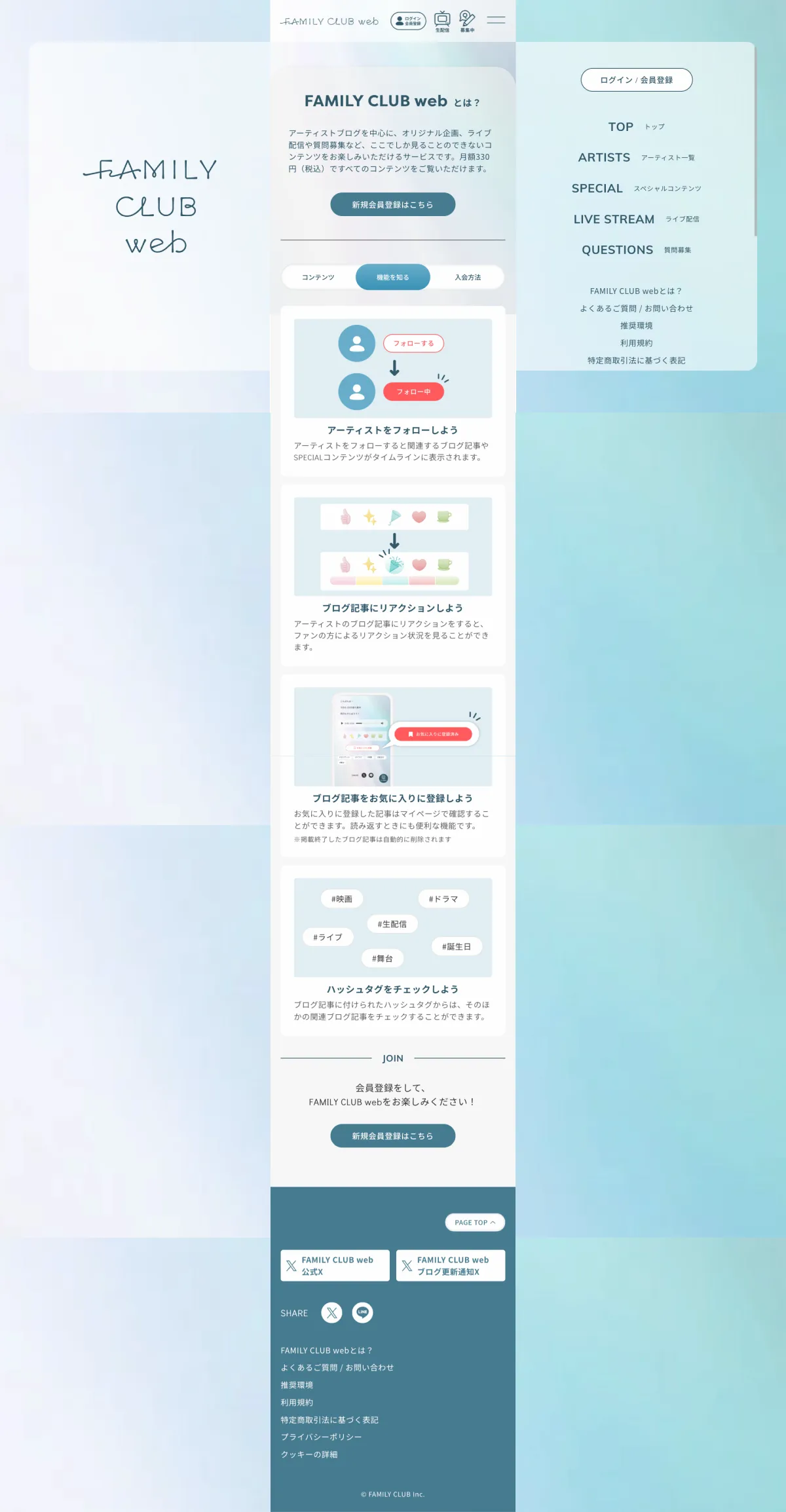 FAMILY CLUB webとは、アーティストブログを中心に、オリジナル企画、ライブ配信や質問募集など、ここでしか見ることのできないコンテンツをお楽しみいただけるサービスです。